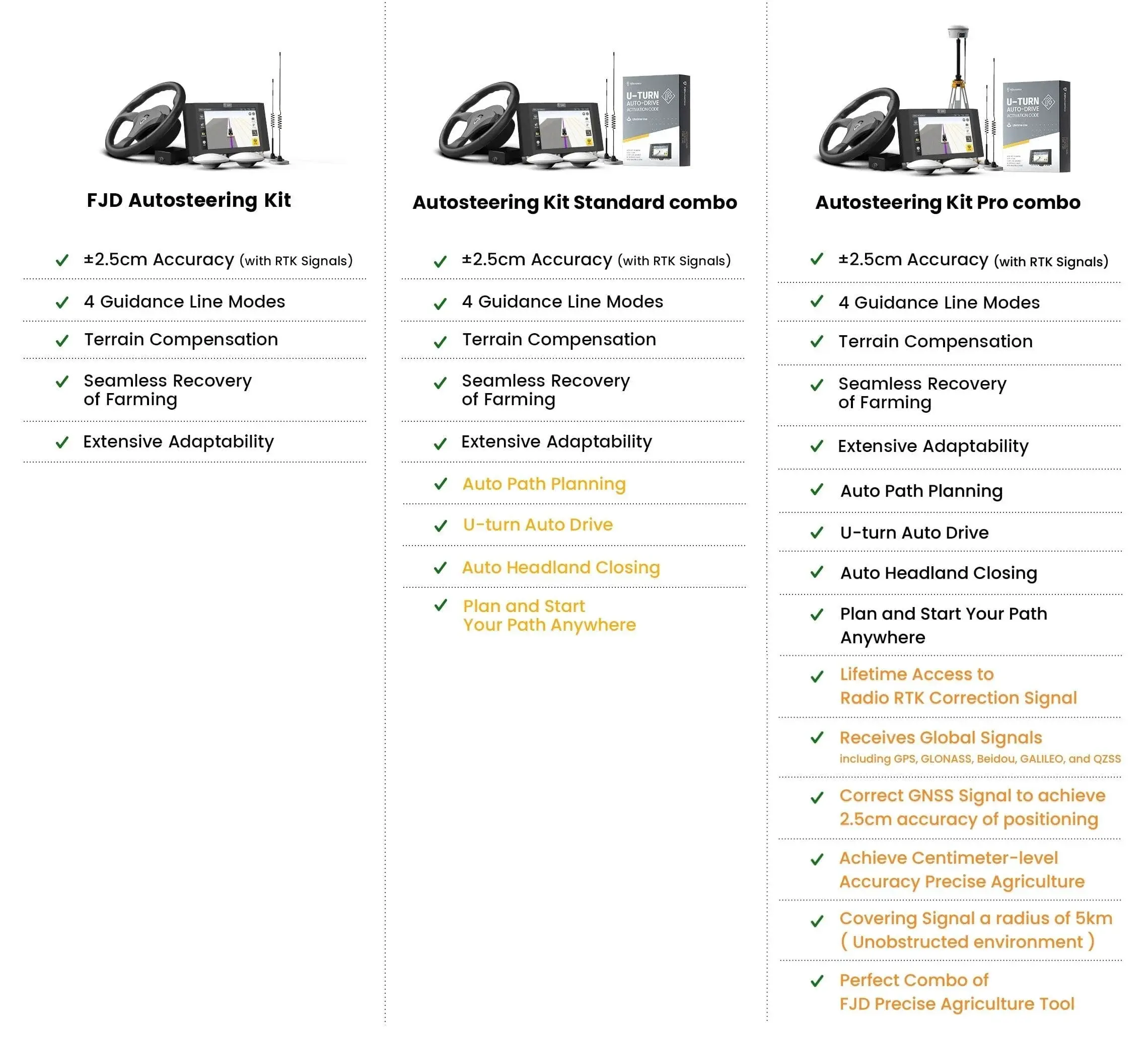 FJD Autosteering Kit is installed on tractors and other machinery to guide them drive along straight lines, curve lines, pivot lines, and A+ lines, it's an advanced system that uses a combination of sensors, GPS technology, and control units to automate the steering process with unparalleled centimeter-level precision across all farming activities from planting and cultivating, to fertilizing and harvesting. Employed state-of-the-art technologies, the FJD tractor guidance system is absolutely your essential precision farming tool.